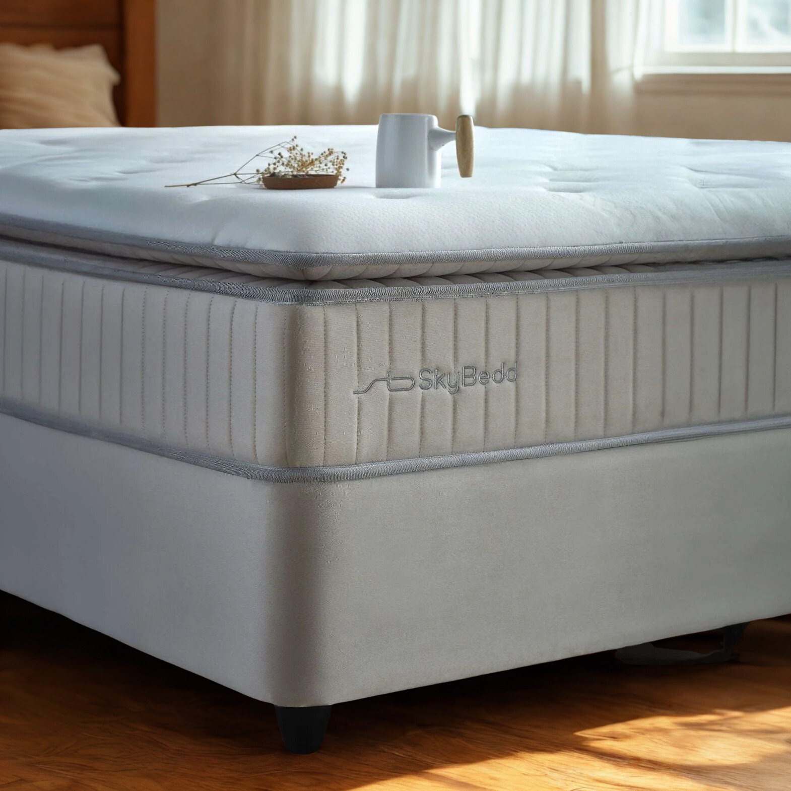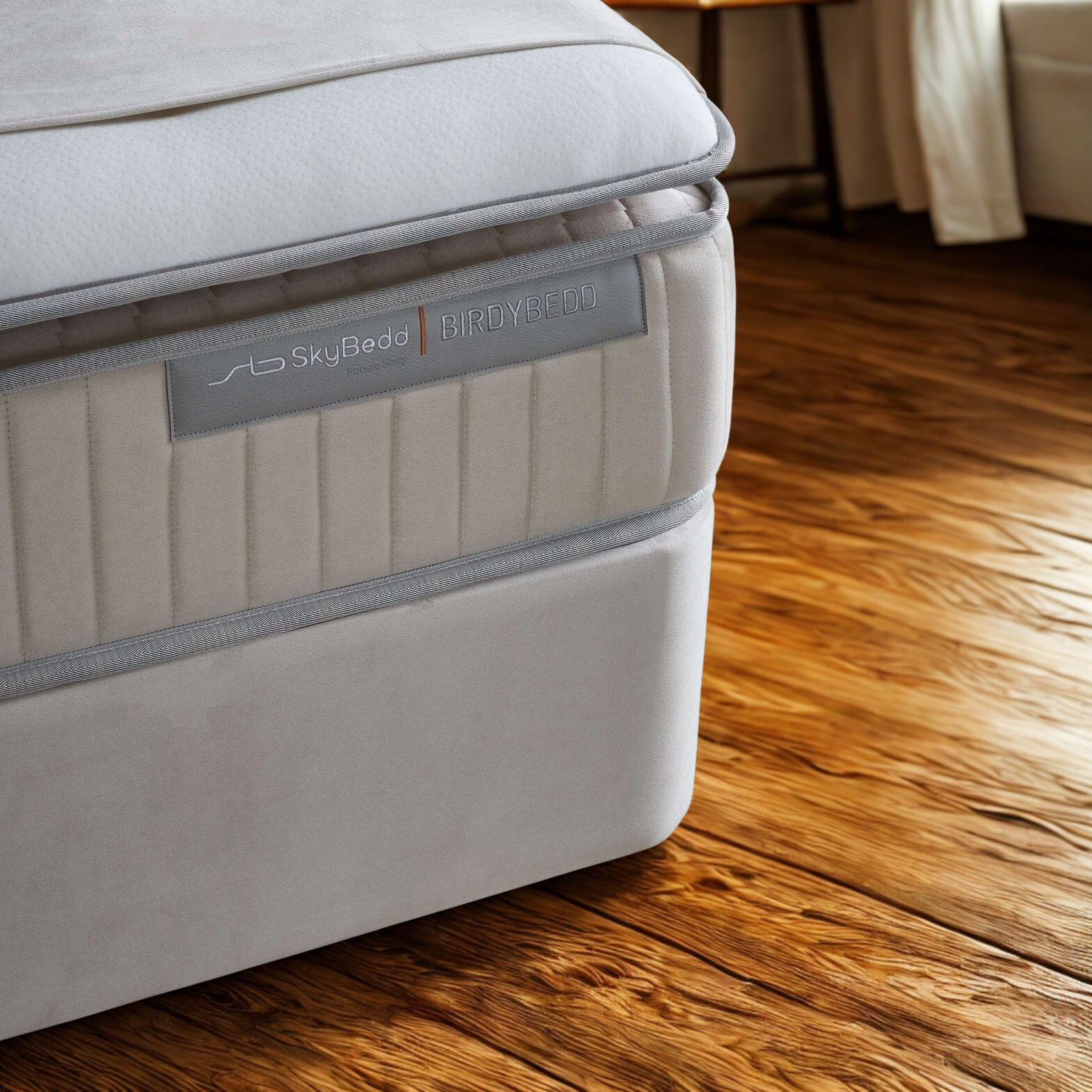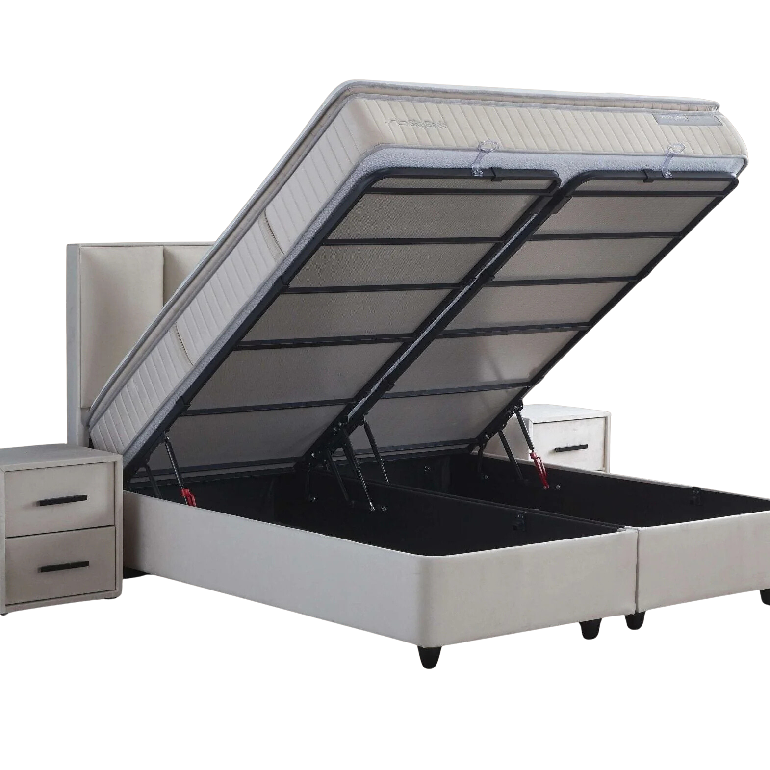 The Skybedd Selene storage boxspring brings together elegance and functionality in a refined, contemporary design. Luxurious velvet upholstery, an imposing headboard with stitched panels, and subtle overhanging lines give this bed a sophisticated presence. Beneath its elegant exterior lies a thoughtfully engineered construction with generous storage capacity—ideal for those who value both aesthetics and everyday convenience.