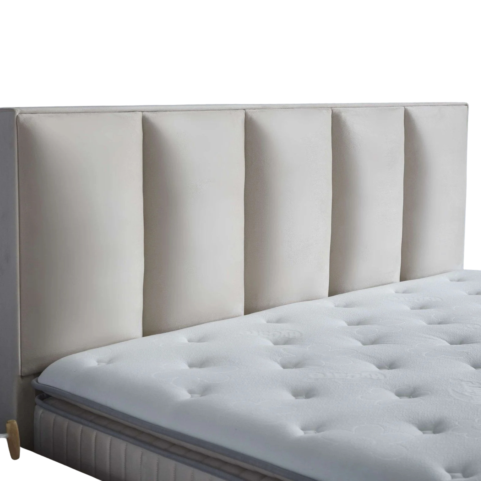 The Selene headboard stands 127 cm high and 15 cm thick, extending 10 cm on each side for a balanced, spacious look. The stitched panel detailing adds rhythm and character to the velvet surface without overwhelming the design. Combined with clean bed lines and black cone-shaped legs, the Selene radiates calm, modern luxury.